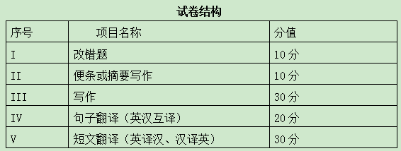 能根据作文题目、提纲或图表、数据等,在30分钟内写出长度为150-200个单词左右的短文,内容切题,结构严谨,条理清楚,语法正确,语言能顺,表达得体;并能根据提示在10分钟内写出长度为50—60个单词左右的应用文,如便条、通知和请帖。在规定时间内翻译句子和短文。要求学生翻译一定难度的句子或段落。题型:英译汉、汉译英。