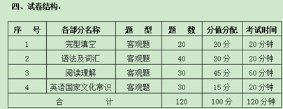 本考试由四个部分组成:完形填空、语法及词汇、阅读理解、英语国家文化常识。