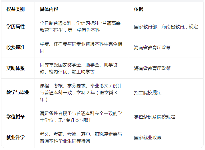 海南统招专升本入学后,官方政策与核心权益和普通本科完全一致,仅在毕业证表述、编班方式、保研资格等细节上有差异,不影响学历效力与就业升学核心通道。